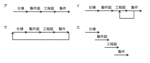コンカレントエンジニアリングを適用した後の業務の流れを表した図として,最も適したものはどれか。ここで,図の中の矢印は業務の流れを示し,その上に各作業名を記述する。