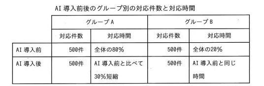 あるコールセンタでは,顧客からの電話による問合せに対応するオペレータを支援するシステムとして,顧客とオペレータの会話の音声を認識し,顧客の問合せに 対する回答の候補をオペレータのPCの画面に表示する AI を導入した。1日の対応件 数は1,000件であり,問合せ内容によって二つのグループ A, Bに分けた。AI導入前後の各グループの対応件数,対応時間が表のとおりであるとき,AI導入後に,1日分の1,000件に対応する時間は何%短縮できたか。