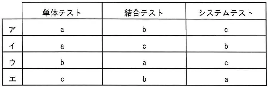 ソフトウェア開発における, テストに関する記述 a ~c とテスト工程の適切な組合せはどれか