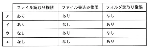 ファイルサーバに保存されている文書ファイルの内容をPCで直接編集した後,上書き保存しようとしたら“権限がないので保存できません”というメッセージが表示された。この文書ファイルとそれが保存されているフォルダに設定されていた権限の組合せとして,適切なものはどれか。