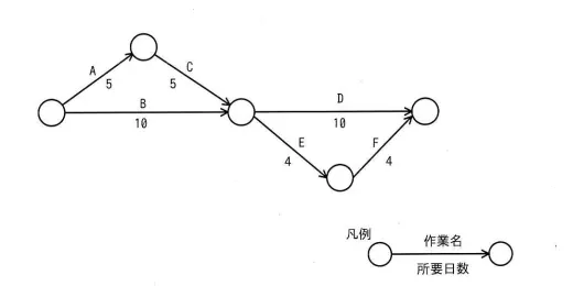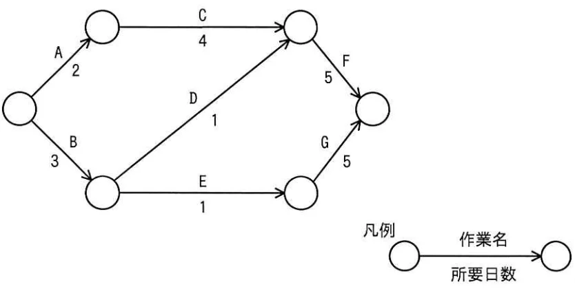 図のアローダイアグラムにおいて,作業 Bが2日遅れて完了した。そこで,予定どおりの期間で全ての作業を完了させるために,作業 D に要員を追加することにした。作業 D に当初20名が割り当てられているとき,作業 D に追加する要員は最少で何名必要か。ここで,要員の作業効率は一律である。