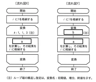 流れ図 X で示す処理では,変数i の値が, 1 → 3 → 7 → 13 と変化し,流れ図 Y で示す処理では,変数i の値が, 1 → 5 → 13 → 25 と変化した。図中の a, b に入れる字句の適切な組合せはどれか。