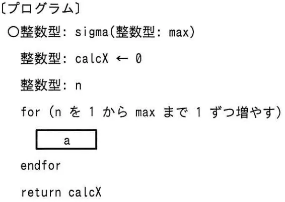 関数 sigma は,正の整数を引数 max で受け取り, 1から max までの整数の総和を戻り値とする。プログラム中のaに入れる字句として,適切なものはどれか。