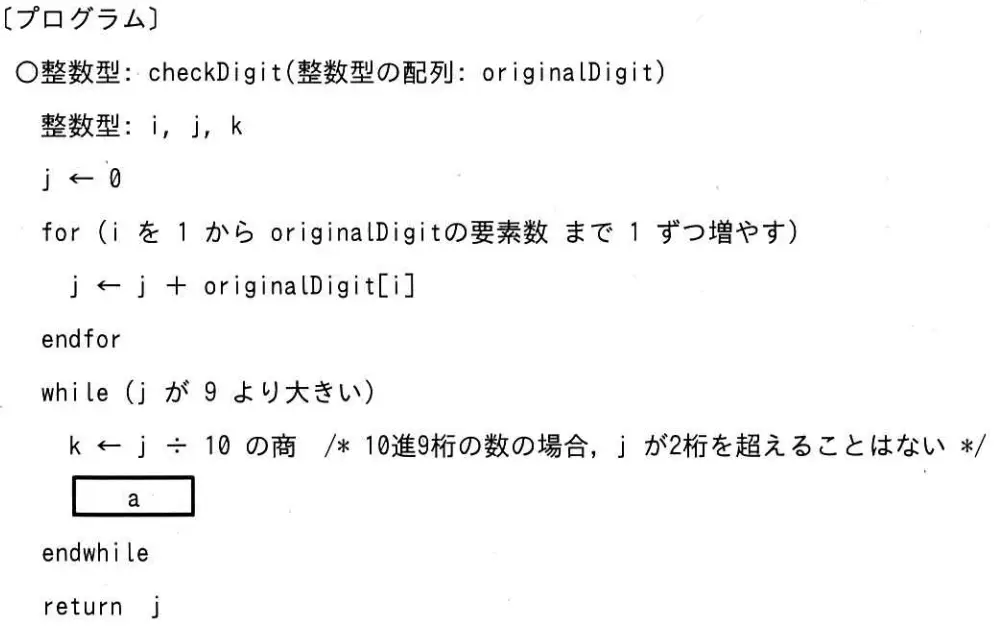 関数 checkDigit は, 10進9桁の整数の各桁の数字が上位の桁から順に格納された整数型の配列 originalDigit を引数として,次の手順で計算したチェックデジットを戻り値とする。プログラム中の a に入れる字句として,適切なものはどれか。ここで,配列の要素番号は1から始まる。