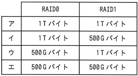 容量が500G バイトのHDD を2台使用して, RAIDO, RAID1を構成したとき, 実際に利用可能な記憶容量の組合せとして,適切なものはどれか。