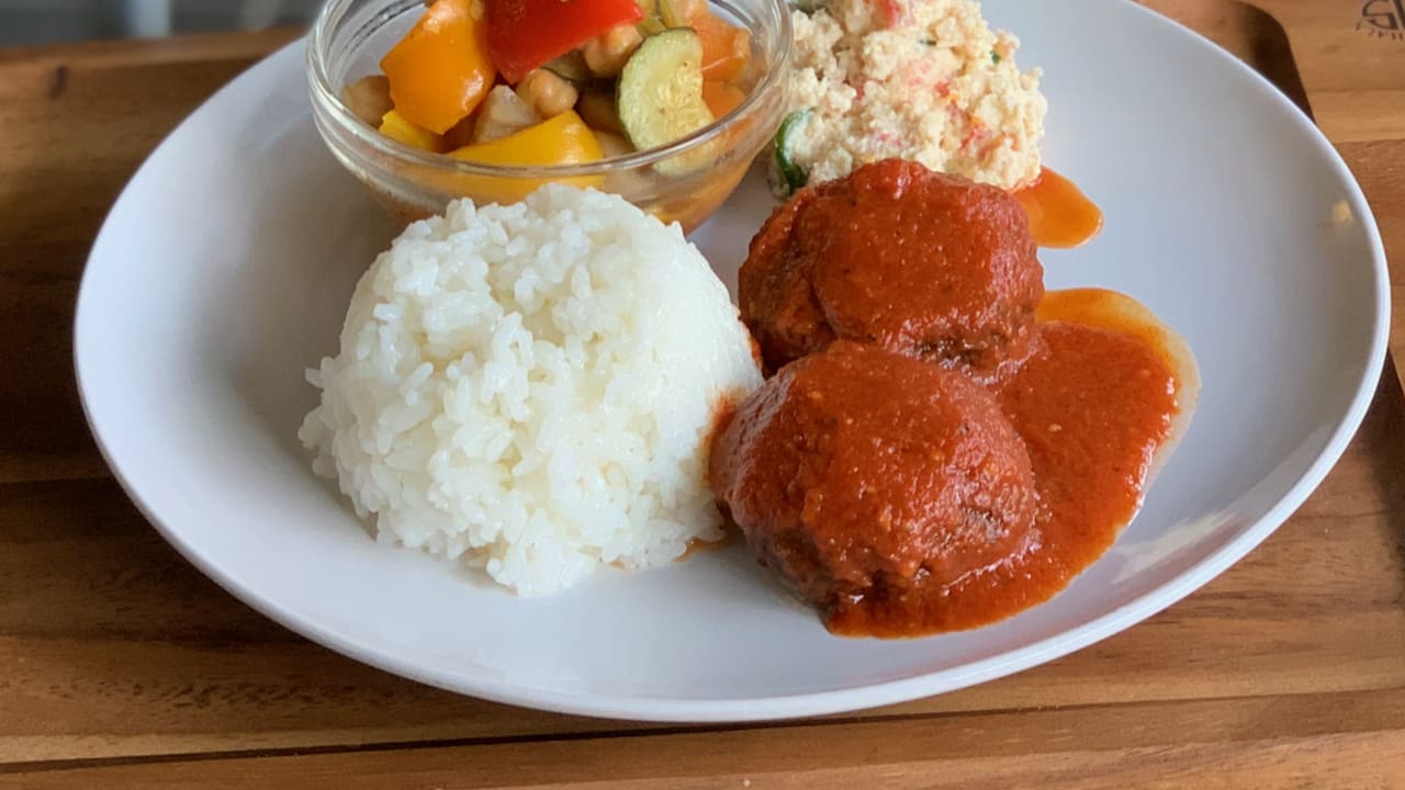 093 村田由恵さんの 食べるヨガレッスン/トマトソースのコフタ献立(Oriental Vegan) 【特製コフタ(村田さんのトマトソース/おからのサラダ/野菜のハーブ煮】