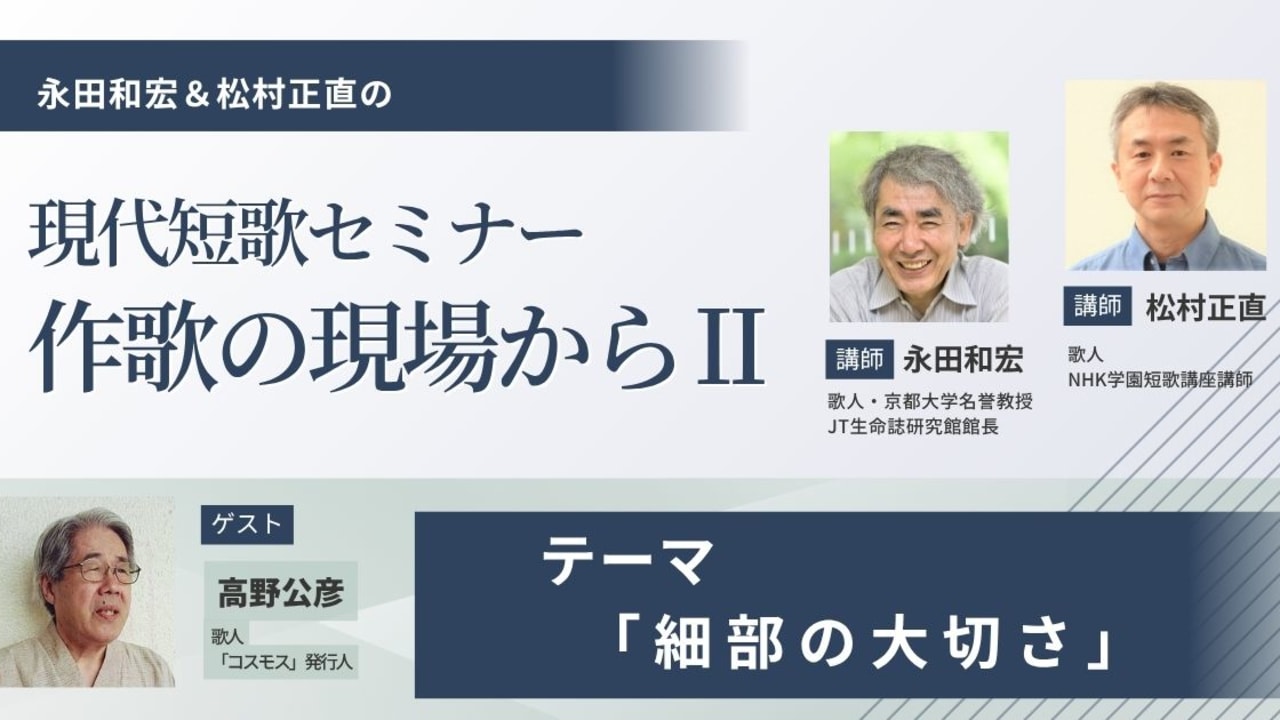 2023年に開講した「現代短歌セミナー 」は、短歌講座監修の永田和宏さん、短歌友の会選者の松村正直さんが毎回一人のゲストを迎え、テーマに基づいて作歌の現場から議論し、歌は多様な考えで作るものであることを学ぶ講座です。
