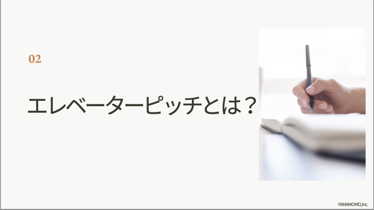 エレベーターピッチと呼ばれる30〜60秒ほどの自己PRや商品紹介ができるプレゼンテーション手法を学べます。