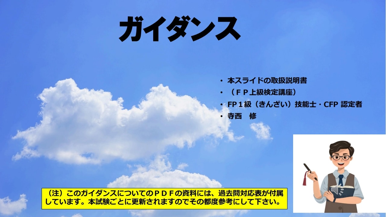 当講座はFP1級・CFP試験の合格を目指す本格的な学習教材です。私は2級の後、FP1級やCFP試験の受験については、いろいろな国家試験の専門分野を学習し受験することを通じて準備してきました。15年近く前のことですが当時は主催者である団体以外には公式の参考書は存在しませんでした。幸い現在は市販の参考書も見られていますが、残念ながら試験内容のレベルもアップしているため、合格の保証は難しいと感じています。おそらく2級合格後はさしたる勉強方法もわからないまま2級で受験を終えてしまい、2級の実力を活かしてさらなる深みにチャレンジにする機会が失われている学習意欲のある方々が多いように思えます。まさにそういった方々のためのツールが本教材であり、この講座を使って、最上級の試験に合格していただくことを通じて、社会に通用する生きた知識を提供する手段となるものです。以前に1級参考書の執筆をしていたことがありますが、参考書の執筆は簡単なのです。なぜなら頻出の内容さえ盛り込んでしまえば売ることができるからです。しかし読者は頻出内容が記載されている参考書ではなく、合格できる参考書を望んでいるはずです。でも最近の試験範囲やレベルを踏まえると膨大な量になってしまい物理的に著作とするのは不可能(たとえ分冊であっても)です。ところがeラーニングが普及している現在では、単元ごとにPDFなどで受験生に教材を配布することができ、膨大な範囲であっても分野ごとに区切ることで効率的に知識を積み上げることができるようになりました。PDFを教材として提供するイメージは12年ほど前から抱いているものであり、ようやく実を結んで受験生に提供できるところまでこぎつけました。またイメージしていたころのものとは異なり近年の本試験は法律分野での出題も増えてきて合格のためのしきいがさらに高くなっているといってもいいでしょう。2級までは過去問の繰り返しでしのげますが、1級の過去問の繰り返しは無駄とは言いませんが、それだけでは合格は厳しいです。ともすればFPの学習ではなく過去問の暗記になってしまいがちです。本講座では過去問の内容も含め生きた知識として会得することができます。