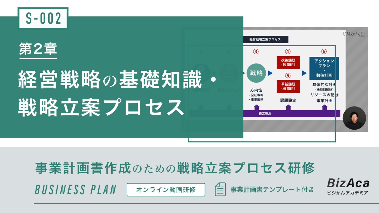 本動画は、【事業計画書作成のための経営戦略立案プロセス研修(全5章 8講座)】の第2章「経営戦略の基礎知識・ 戦略立案プロセス」です。