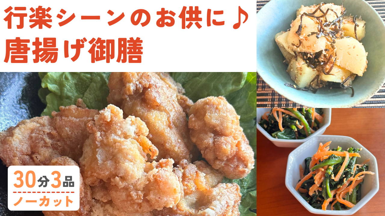 カリッと鶏のからあげ /ほうれん草とにんじんの胡麻ポン和え /塩昆布とおかかの和風ポテサラ