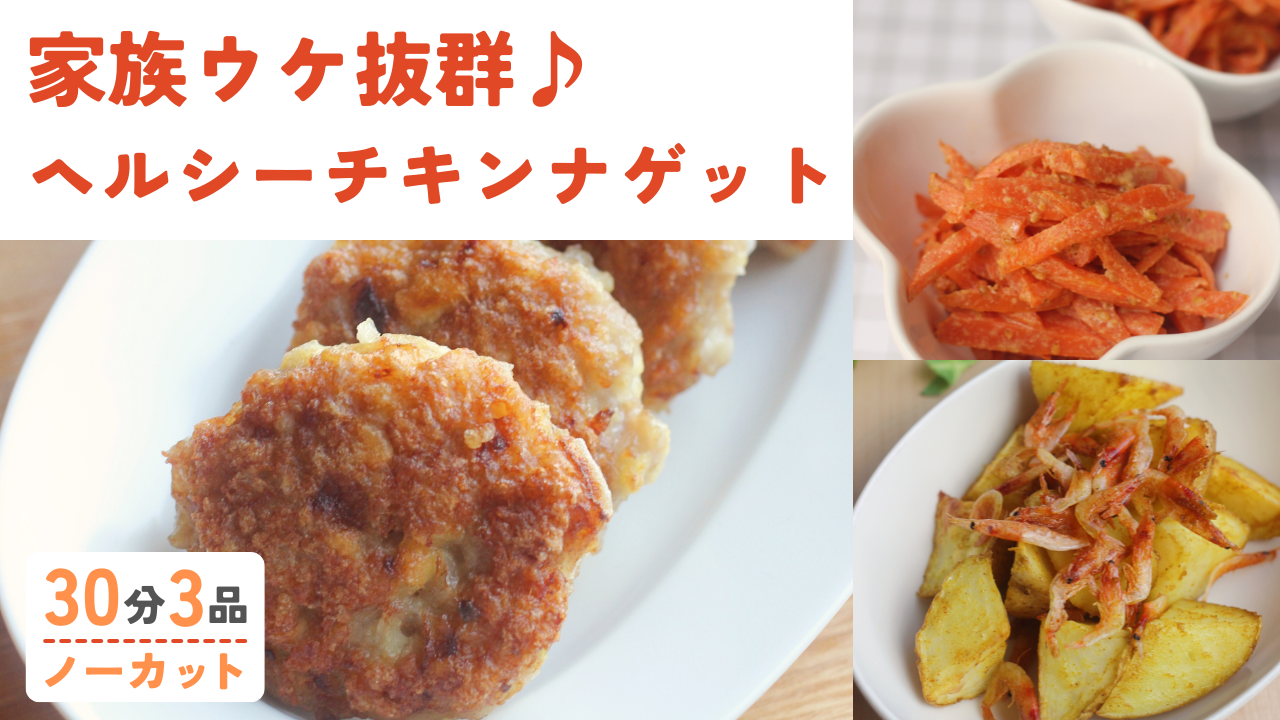 やみつき!ふわふわチキンナゲット /香ばしさがクセになる♪じゃがいもと桜エビのソテー /人参のごまマヨネーズ和え