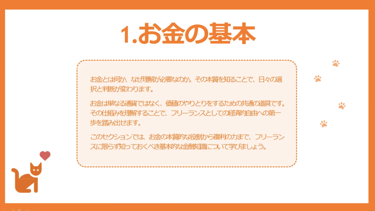 フリーランスのためのお金の教養(初級編)を受講し、基礎的なお金の知識を学ぶことができました。 普段あまりお金の勉強をする機会がなかったので、初歩から丁寧に教えていただき、とても分かりやすかったです。 特に、会社員時代には経験のなかった確定申告についても基礎から学べ、今後に役立つ内容でした。