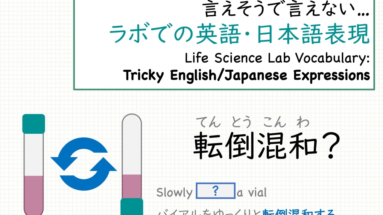 「メスアップする」「転倒混和する」「上澄をピペットで吸って捨てる」って、英語でどう言うの? なかなか言えない・書けないあの操作を、自分で表現できるようになりましょう。