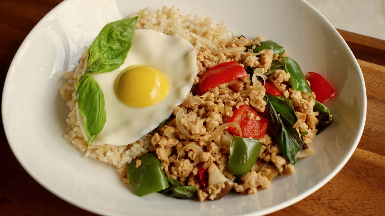 このレッスンでは、大豆ミートとたっぷりの野菜、そしてバジルで作るガパオライスを学びます。