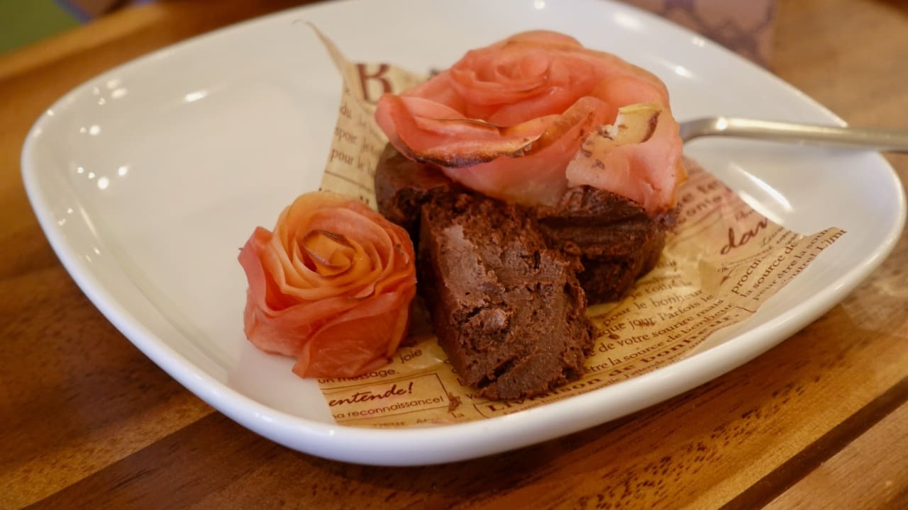 ・デザート/ごぼうとココアのスフレ りんごの薔薇仕立て