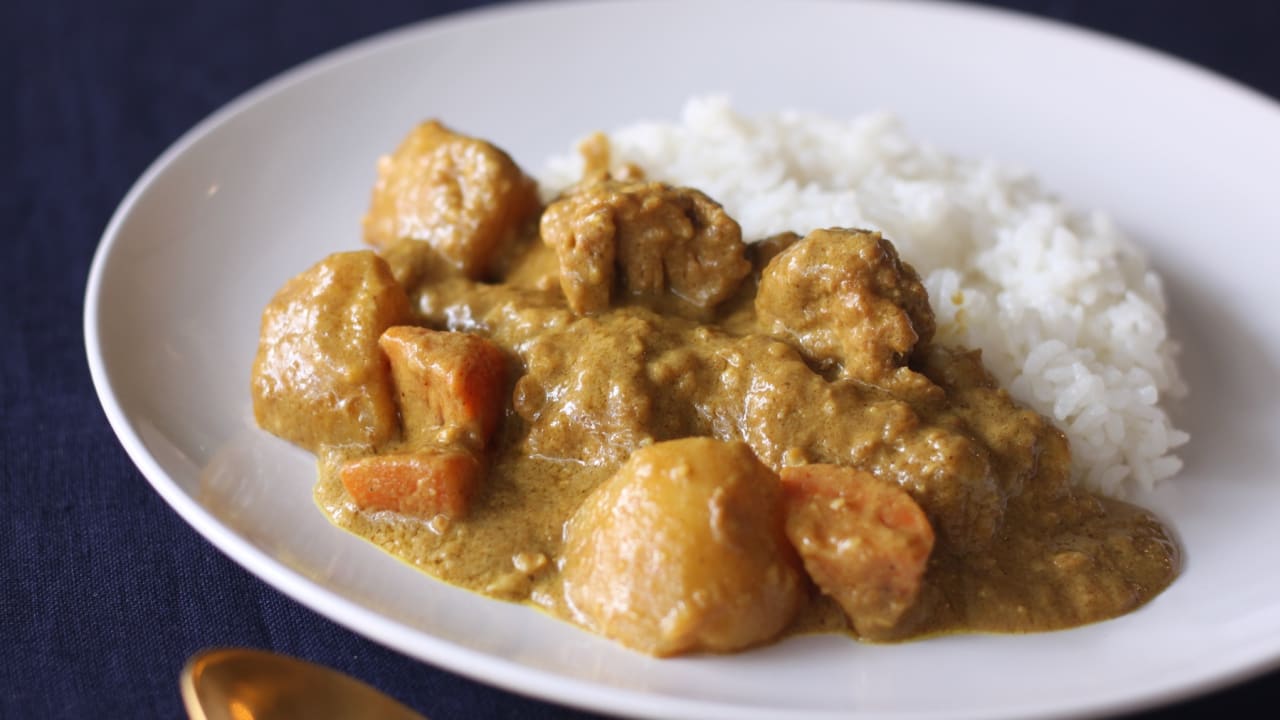 マッサマンは、ゴロゴロの野菜と肉をたっぷりめのココナッツミルクで煮込んだ濃厚な、タイ風カレー。