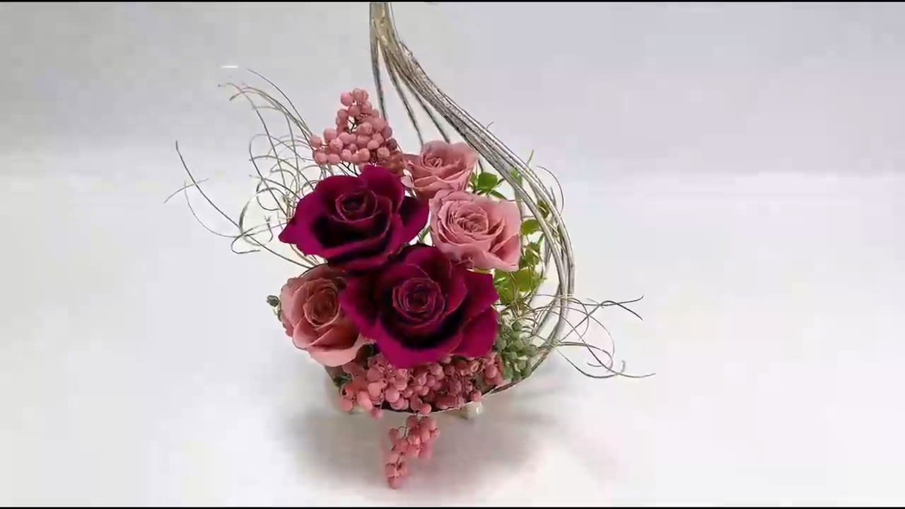 エレガントなシルバーワイヤー花器にプリザーブドフラワーのバラ、ペッパーベリーをアレンジの動画レッスンです。
