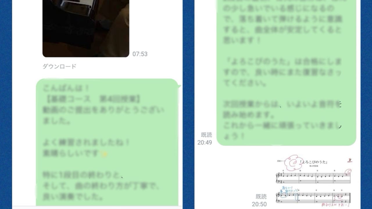 「基礎コース」にある個人指導対象の6曲について、LINEで演奏動画をお送りいただくことで、講師が直接、お一人お一人にに寄り添った丁寧な添削とアドバイスをいたします。