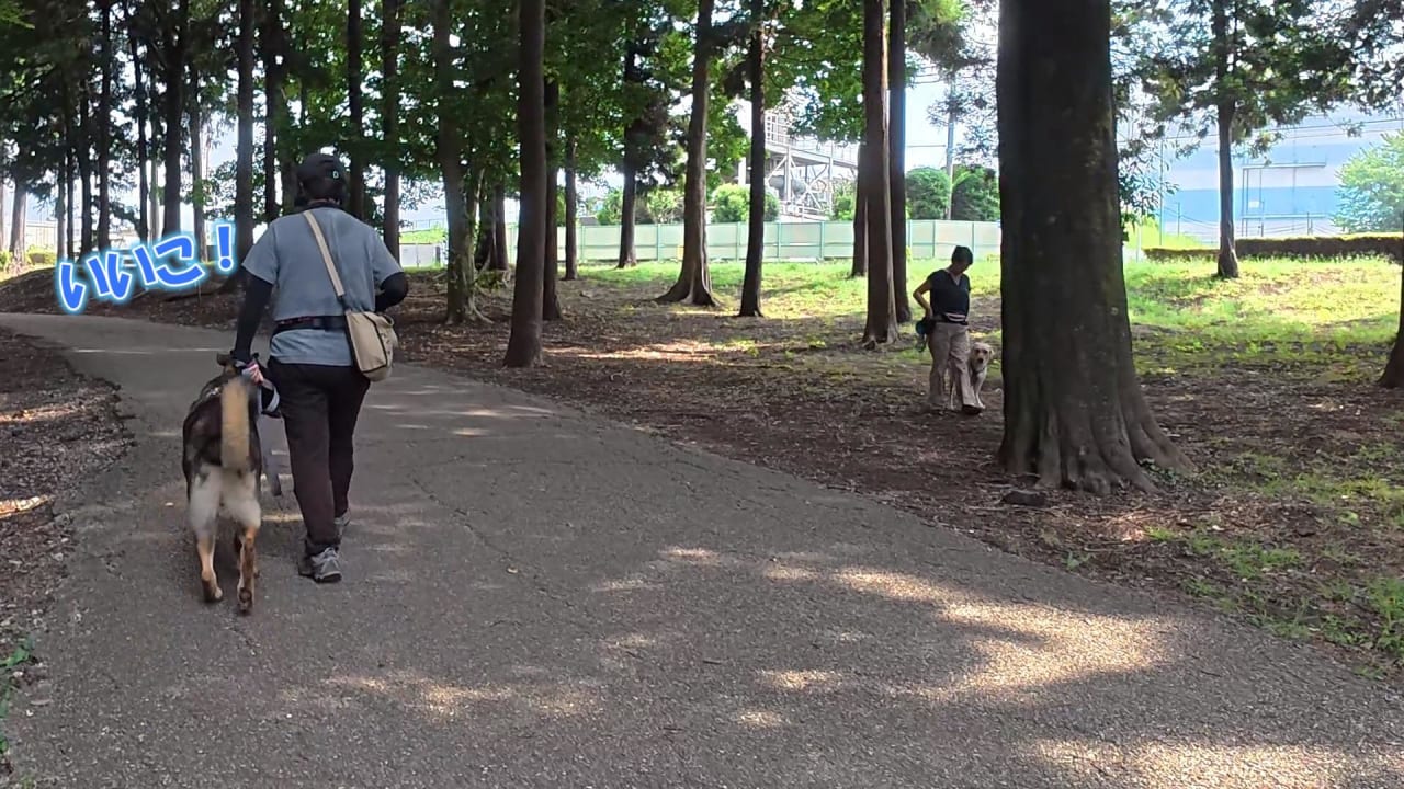 他犬に吠え、突進してしまう子。練習してある程度良くなったので、一緒に歩く練習へ。