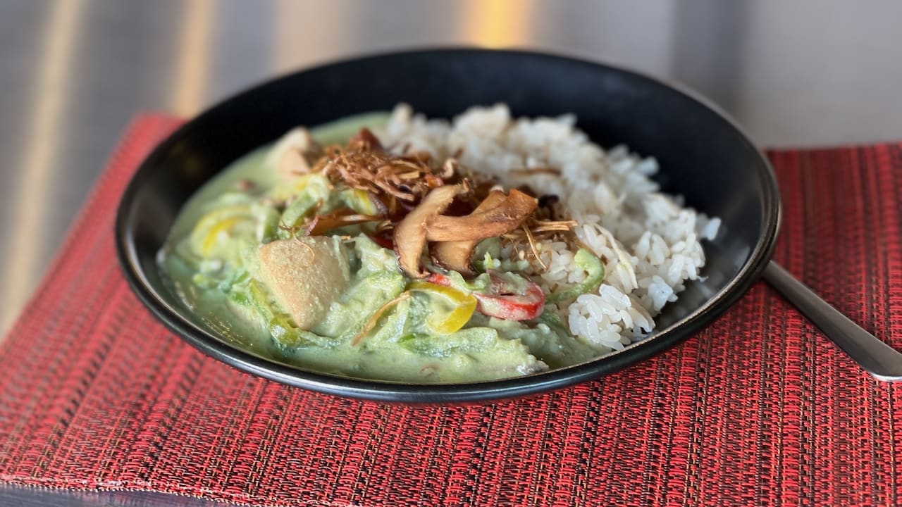 写真のタイ風カレーは秋野菜たっぷり、滋味深いおいしさですが、フライドきのこをトッピングすると「塩入れたかな」と勘違いするおいしさに!