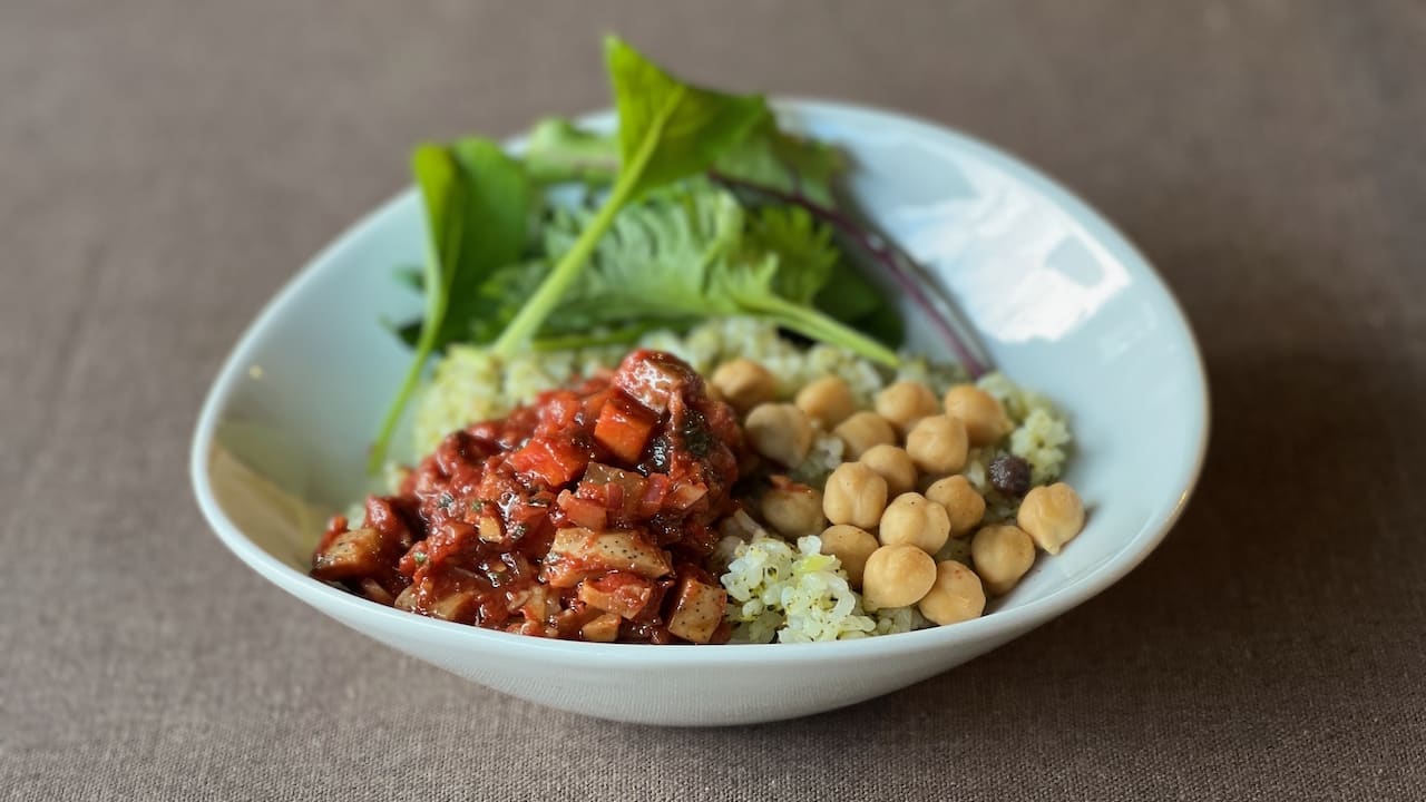 ・塩抜きカポナータボウル(ブロッコリーの炊き込み塩抜きピラフ/塩抜きカポナータ/ひよこ豆のピリ辛マリネ)