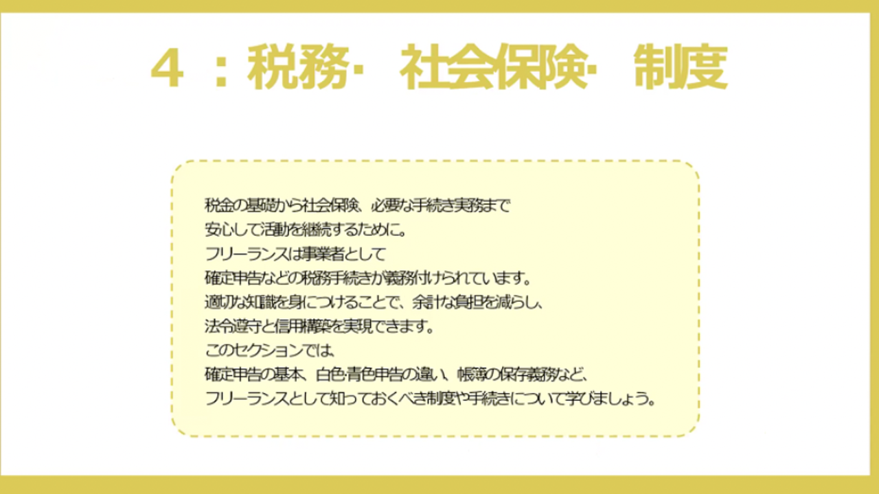 確定申告の基本、白色・青色中告の違い帳等の保存義務など、フリーランスとして知っておくべき制度や手続きについて学びましょう。