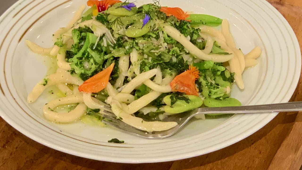 そら豆や季節の葉物野菜をつかってのオイルパスタに仕上げます。