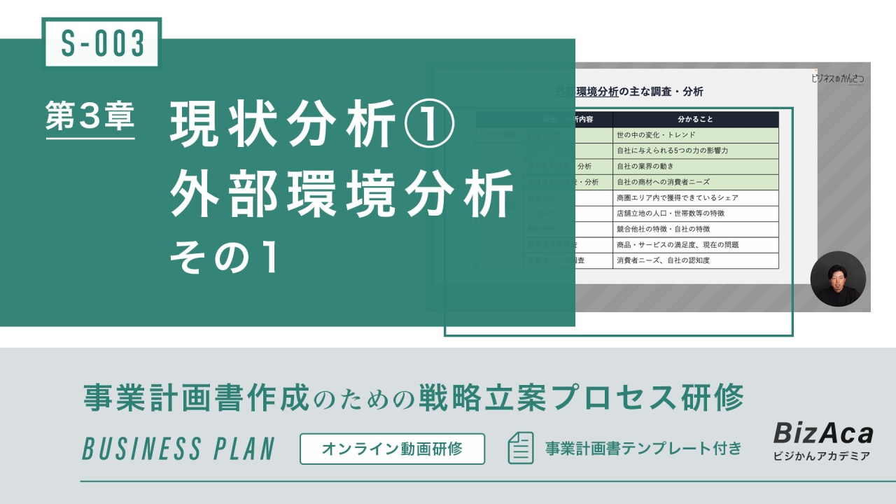 本動画は、【事業計画書作成のための経営戦略立案プロセス研修(全5章 8講座)】の第3章「現状分析①外部環境分析その1」です。
