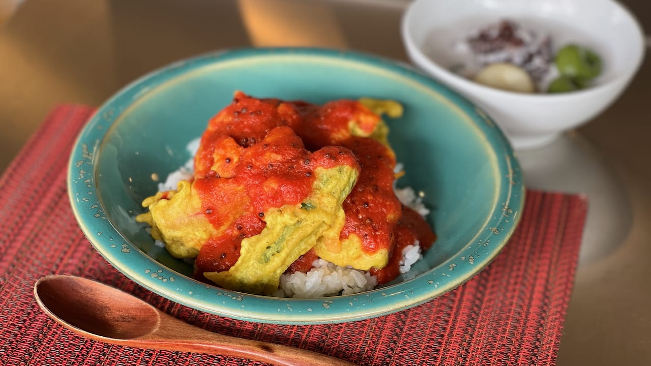 239 村田由恵さんの食べるヨガレッスン/パコーラ丼とココナッツぜんざい 【パコーラ丼(野菜のパコーラ、スパイス入りトマトソース)/ココナッツぜんざい】