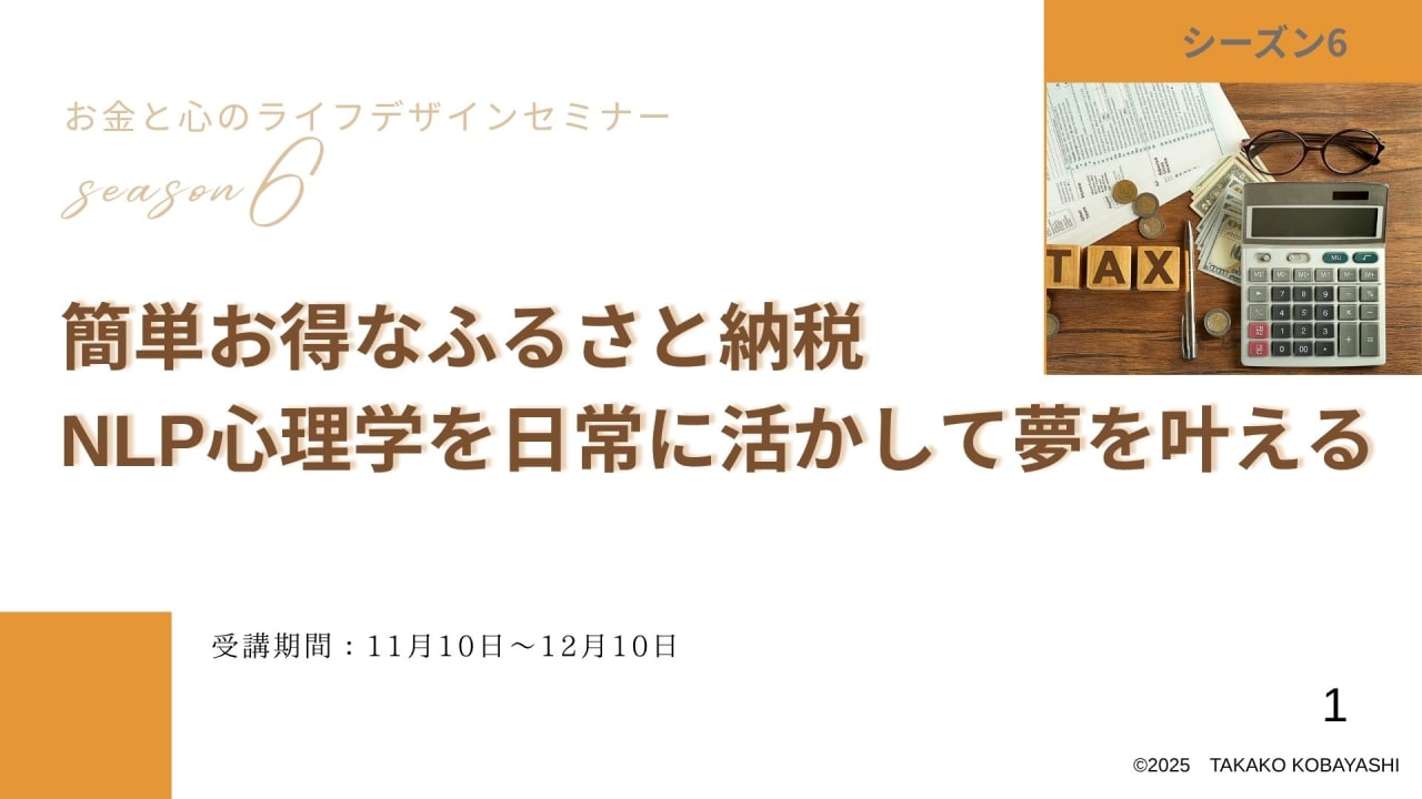 今回のシーズン6では、「簡単お得なふるさと納税」と「NLP心理学を日常に活かして夢を叶える」という2つのテーマでお届けします。