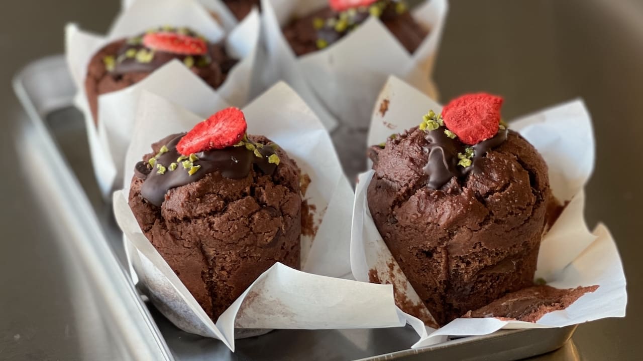 5度目のレッスンとなるこのレッスンでは、看板メニューのマフィンから、チョコクリームがとろり溶け出すダブルチョコマフィンを学びます。