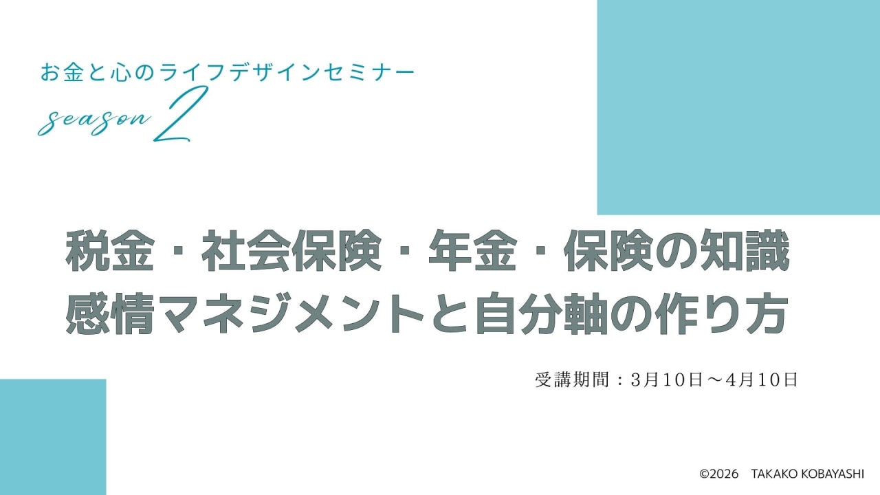 この講座では、所得税・住民税・年末調整・確定申告といった税金の基本から、生命保険と税金の関係まで、生活に役立つ知識をわかりやすく解説します。さらに社会保障制度についても、老齢年金・遺族年金・障害年金の3つの年金制度や、年金の繰り上げ・繰り下げ、傷病手当、高額療養費制度など、いざという時に役立つ仕組みを学びます。制度の全体像を理解することで、将来に対する漠然とした不安を安心へと変えていきます。