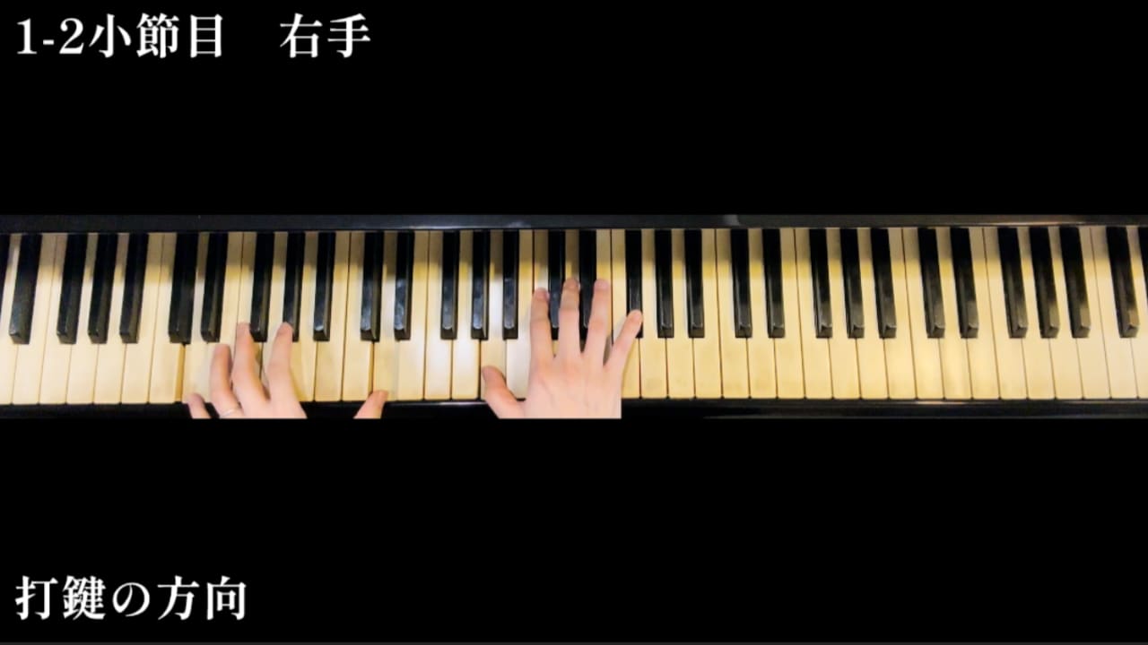 ・1-2小節目右手(指遣い、打鍵の方向、ペダル)