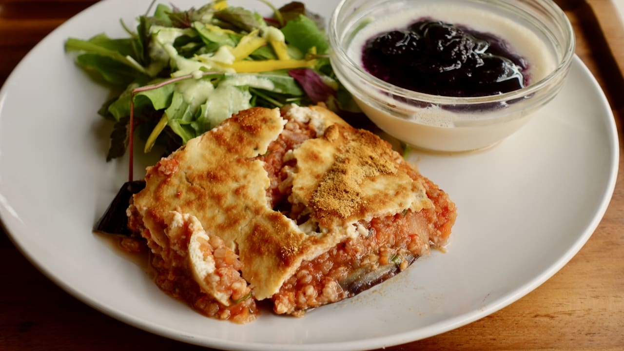 117 村田由恵さんの 食べるヨガレッスン/まさかのムサカとひんやりパンナコッタ(Oriental Vegan) 【まさかのムサカ/枝豆ドレッシング/ヴィーガンパンナコッタ】