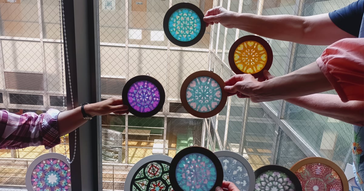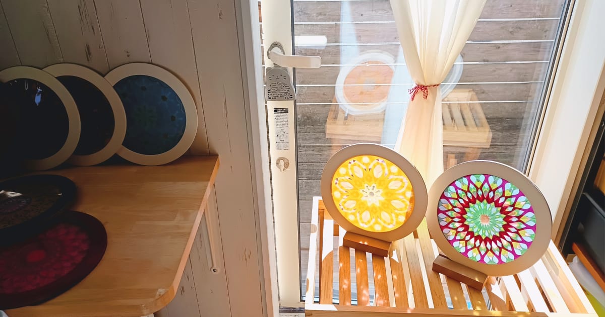 奈良県でローズウィンドウ切り紙教室を月1回開催しています。ローズウィンドウとは紙工作で作る、本物のステンドグラスのような置物です。見た目より簡単で美しいものが出来上がります。
