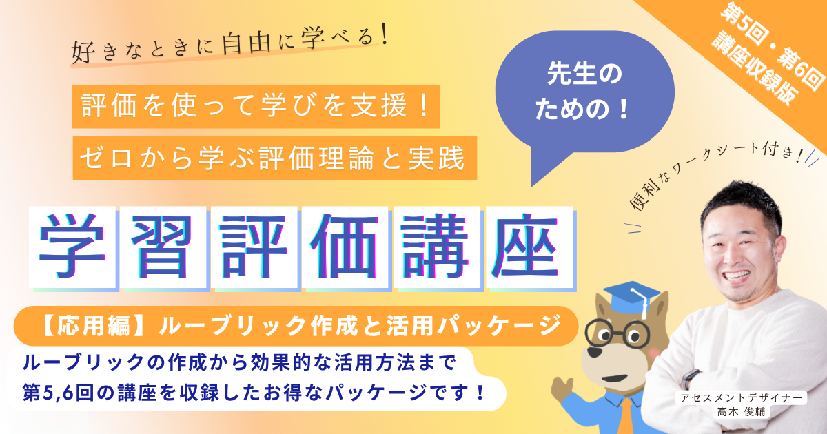 人気の教育評価研修がお得なパックに! 第5回、第6回をセットした【応用編】ルーブリック作成と活用パッケージです。 学習を支援するためのルーブリックの作り方と、効果的に活用するための方法と注意点について学んでいただきます。 講師は、メルボルン大学教育学大学院で教育評価について学び、現在は私立中高一貫校で教諭として働くかたわら、アセスメント・デザイナーとして研修や、企業の教育プログラムに関わる評価制度の監修などを行なっている髙木俊輔が担当します。 ルーブリックの理論を学び、実践に活かしてみませんか? 「評価って、なぜ必要なんだろう?」とお悩みの先生方にこそ、ぜひおすすめの講座です!