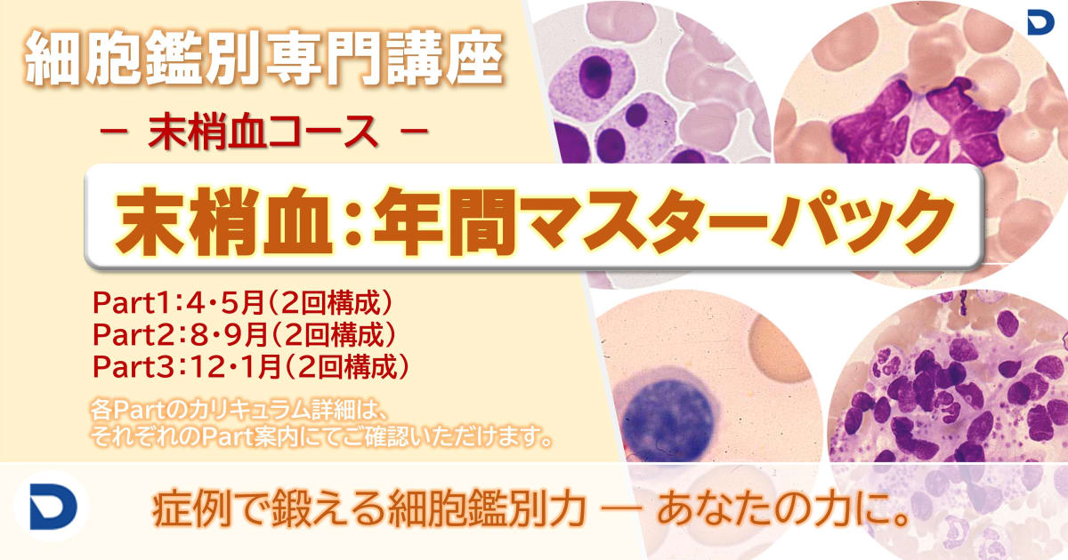 -細胞鑑別専門講座〈末梢血・年間マスターパック〉- Part1~Part3すべてに参加できる、末梢血に特化した細胞鑑別の年間専門プログラムです。単発受講では得られない、“徹底的で連続性のある鑑別訓練”を実現します。 本パックでは、年間全6回のライブ講座に参加可能。各回とも録画配信を実施しているため、当日参加が難しい場合でも後日視聴が可能です。スケジュールが未確定でも、学びが無駄になることはありません。さらに、質疑応答フォローを通じて、講座内で生じた疑問や日常業務での判断の迷いを解消。無理なく、ご自身のペースで、確実に鑑別力を積み上げられる設計です。 また、年間一括申込により、Partを個別に申し込むより20%優遇価格で受講いただけます。体系的に鑑別力を完成させたい方に最適化した受講形態です。 【Part構成】 ■Part1(4–5月/全2回) 迷いやすい白血球類似細胞の鑑別ポイント―境界例を見極める視点の整理― 分葉核球と桿状核球、桿状核球と後骨髄球、異型リンパ球と芽球など、判断が揺らぎやすい所見を体系的に整理します。 ■Part2(8–9月/全2回) 赤血球・血小板の形態異常を見極める―大きさ・染色性・封入体・形状異常の徹底理解― 形態変化を的確に捉え、数値や病態と結びつけて解釈する力を養います。 ■Part3(12–1月/全2回) 画像から読み解く異常細胞鑑別と血液疾患―見落とし厳禁の症例を徹底検討― 白血病細胞、異常リンパ球、骨髄異形成腫瘍、反応性変化などを整理し、最終判断へとつなげる実践力を磨きます。 1年を通して、鑑別精度と判断スピードを段階的に高める設計です。「何となく見る」から「根拠をもって言い切る」へ。 細胞鑑別を“得意”から“武器”へ。末梢血細胞を、本当に読み切れる技術者へ。 ※各Partの詳細なカリキュラム内容は、それぞれのPart案内にてご確認いただけます。 ※年間パックはPart2開始前日(8/28)までお申込み可能です。Part1で終了した講座および質疑内容も、すべて配信にてご確認いただけます。 ※申込み状況により、期限前に受付を終了する場合がございます。あらかじめご了承ください。