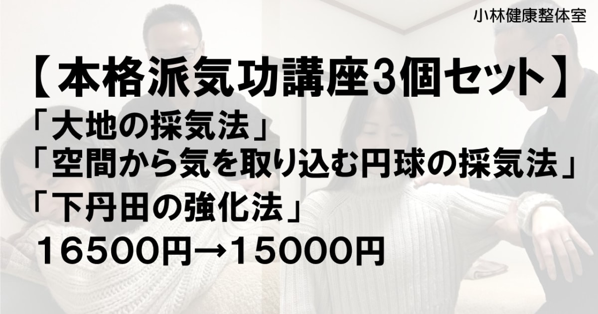 3つの講座のセット(16,500円→15000円)です。 収録内容は「大地の採気法」、「空間から気を取り込む円球の採気法」、「下丹田の強化法」です。