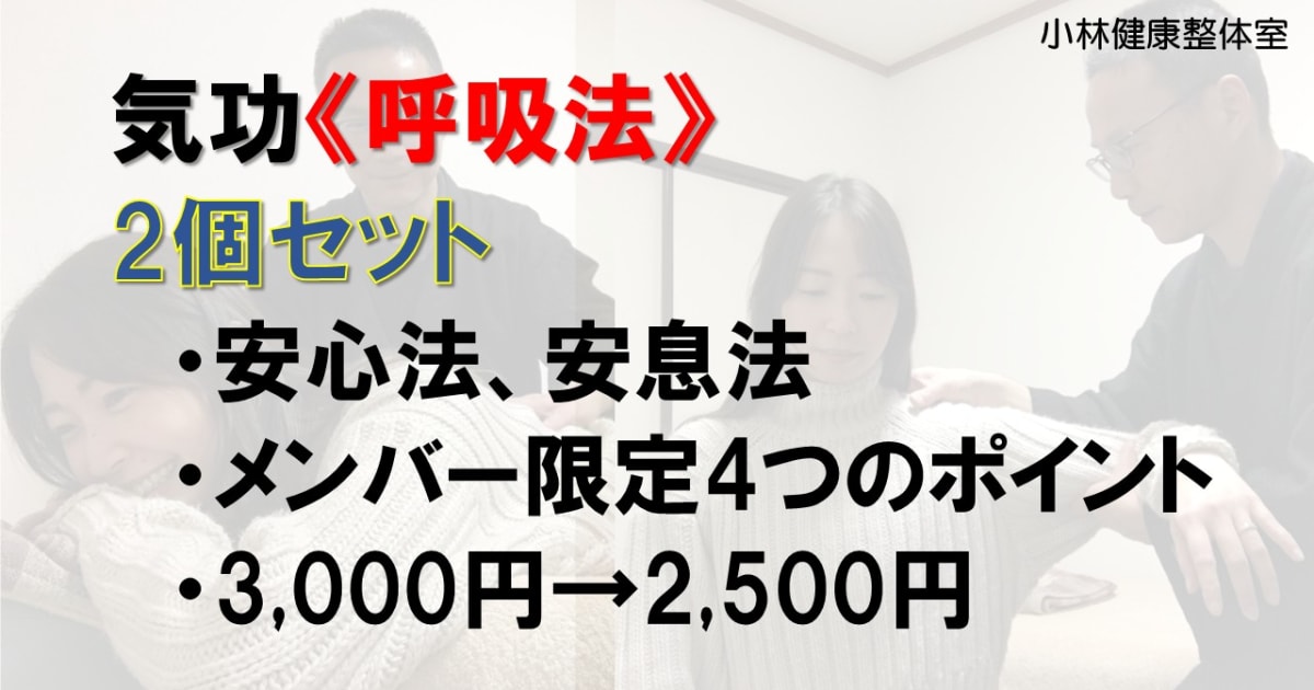 「気功《呼吸法》安心法、安息法」と「気功《呼吸法》4つのポイント」の2個セットです 3,000円→2,500円とお得です