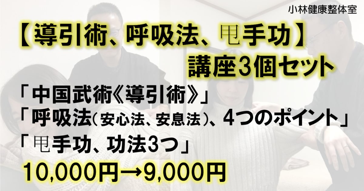 以下の講座のセットです 「中国武術《導引術》」 「呼吸法(安心法、安息法)、4つのポイント」 「甩手功、功法3つ」 10,000円→9,000円