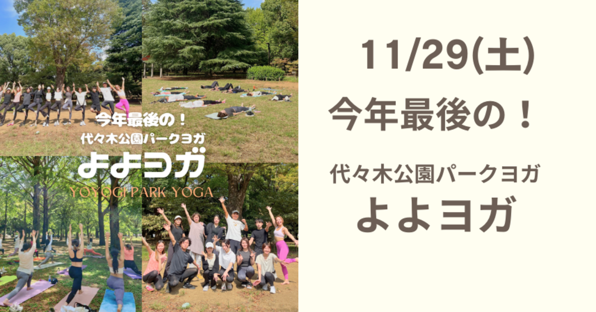 春から定期開催していた、代々木公園パークヨガ「よよヨガ」は、ついに今年最後の回を迎えます。 -- 最終回は**75分のスペシャルクラス**、そして**スペシャル価格です!** 次の開催は半年後の予定!この機会にぜひご参加ください。 ■開催日時 11月29日(木)11:00〜12:15 ■レッスン内容 [Nature Bliss Yoga] 自然の中で至福の時間を過ごすヨガクラス。お日様の暖かさ、風が肌に触れる感覚、草木のサラサラとした音、大地の香り、自然の中でより快適に、より開放的に。豊かな自然を存分に感じられる、ダイナミックなポーズを中心に行います。 ■スケジュール 10:50 集合 11:00クラス開始 75min拡大版 12:15 終了 ■集合場所 10:50 代々木公園 原宿門時計塔付近 集合 ヨガができる服にお着替えした状態でお集まりください。 ■参加費 [最終回Thank You価格です!] ・今年1回以上よよヨガに参加した方¥1,500 ・はじめて参加の方¥2,000 ・サブスク/チケットご利用中の方 無料ご招待 よよヨガリピーター特別価格¥1,500ご予約専用ページはこちら↓↓ https://college.coeteco.jp/date_groups/mel0HGMe ■持ち物 ・ヨガマット、ヨガラグ ・ヨガができる格好 ・飲み物 ■あると便利な物 ・レジャーシート (ヨガマットの汚れを防ぎます) ・タオル (汗拭き、冷え防止) ・虫よけグッズ ■開催可否について 雨天中止。 中止の場合には、講師Instagramと、予約サイトのメッセージにてお知らせします。 ■キャンセルポリシー 前日〜当日100% ※無断欠席はお控えいただき、必ず事前のご連絡をお願いいたします。