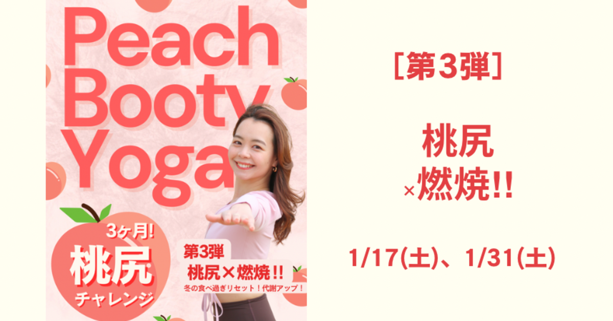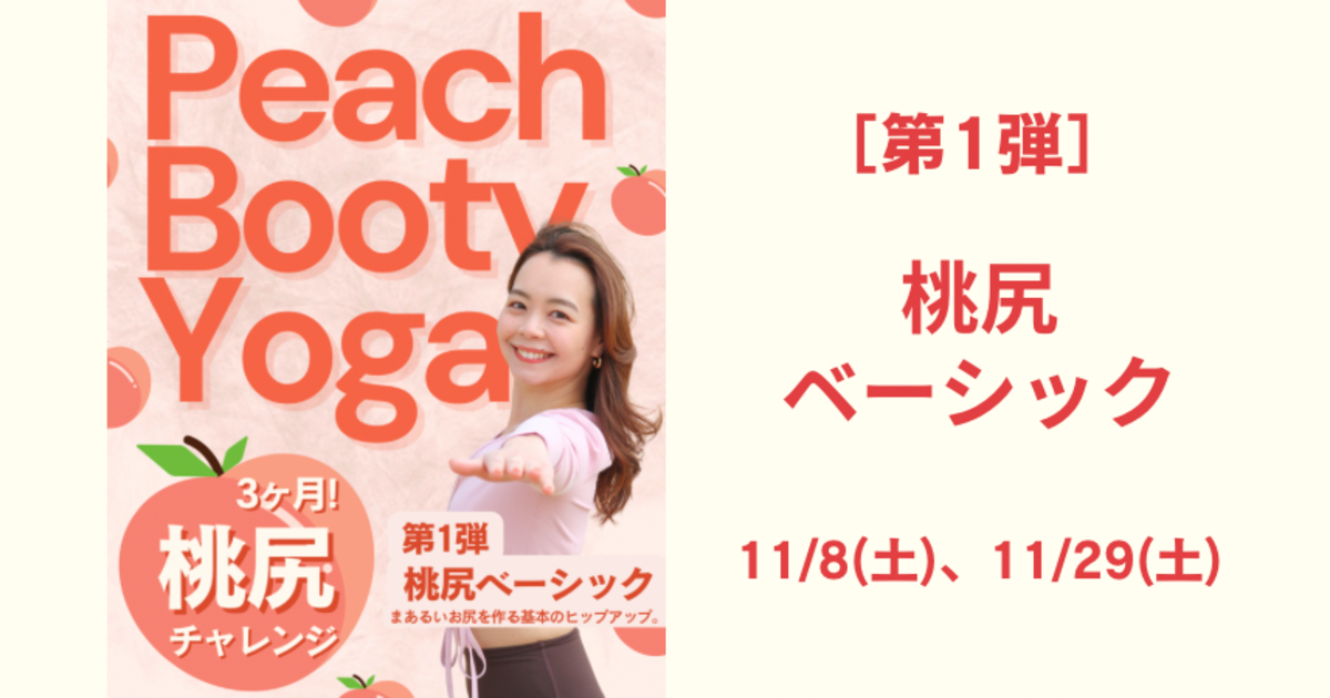 🍑新START! 桃尻ヨガ 3ヶ月チャレンジ🍑 -- 〜お尻が上がると、ココロも上がる♡〜 **開催:毎月2回・土曜朝** **期間:11月〜1月/全6回限定クラス** 11月から始まる新シリーズは「桃尻」づくしの3ヶ月! ヒップアップに特化したヨガで、理想のラインをつくろう! 「桃尻」を軸に、月ごとにテーマを変えて、 美尻+全身バランスを整えるスペシャルシリーズ✨ 初心者も大歓迎!楽しみながら変わる“ご褒美ヨガ”! 「筋肉痛になった!」そんな声が続出した人気クラスが、パワーアップして帰ってきました🔥 **💕シリーズスケジュール** 11月|🍑**桃尻ベーシック** まあるいお尻をつくる、基本のヒップアップヨガ。 眠っているヒップ筋を呼び起こして、上向きラインを目指す! ぷりっと感を実感できる、桃尻の第一歩✨ 12月|🍑**桃尻×下半身シェイプ** 足先までぽかぽか♡ 冬の美ラインづくり月間。 冷え・むくみを解消しながら、脚までスッキリ。 お尻から脚先まで血流を促して、全部ほぐれて軽くなる! 1月|🍑**桃尻×燃焼** 食べすぎリセット!代謝アップ&ぷりっと桃尻♡ お正月太りをなかったことに! お尻の大きな筋肉を使って、代謝を底上げ。 2026年のスタートを、スッキリ軽やかに🌅 🌸詳細情報 * 開催日程:毎月2回・土曜朝(全6回) * 時間:45分 * 場所:Aivic Studio渋谷駅宮益坂口徒歩5分 * 料金:1回2,200円(レンタルマット+300円) * 対象:オールレベル!初心者歓迎🔰✨ [第1弾 桃尻ベーシック]11/8、11/29 [第2弾 桃尻×下半身シェイプ]12/6、12/27 [第3弾 桃尻×燃焼‼︎]1/17、1/31 **タイムスケジュール** 8:50 ドアオープン 8:55 までに集合 9:00 クラススタート 9:45 クラス終了 お得な桃尻4回チケットあります🎫 -- 1回あたり**500円お得!** 4回合わせて**2,000円お得!** 🍑チケット詳細&購入🍑 ➡️ https://college.coeteco.jp/live/5oe0ckxw