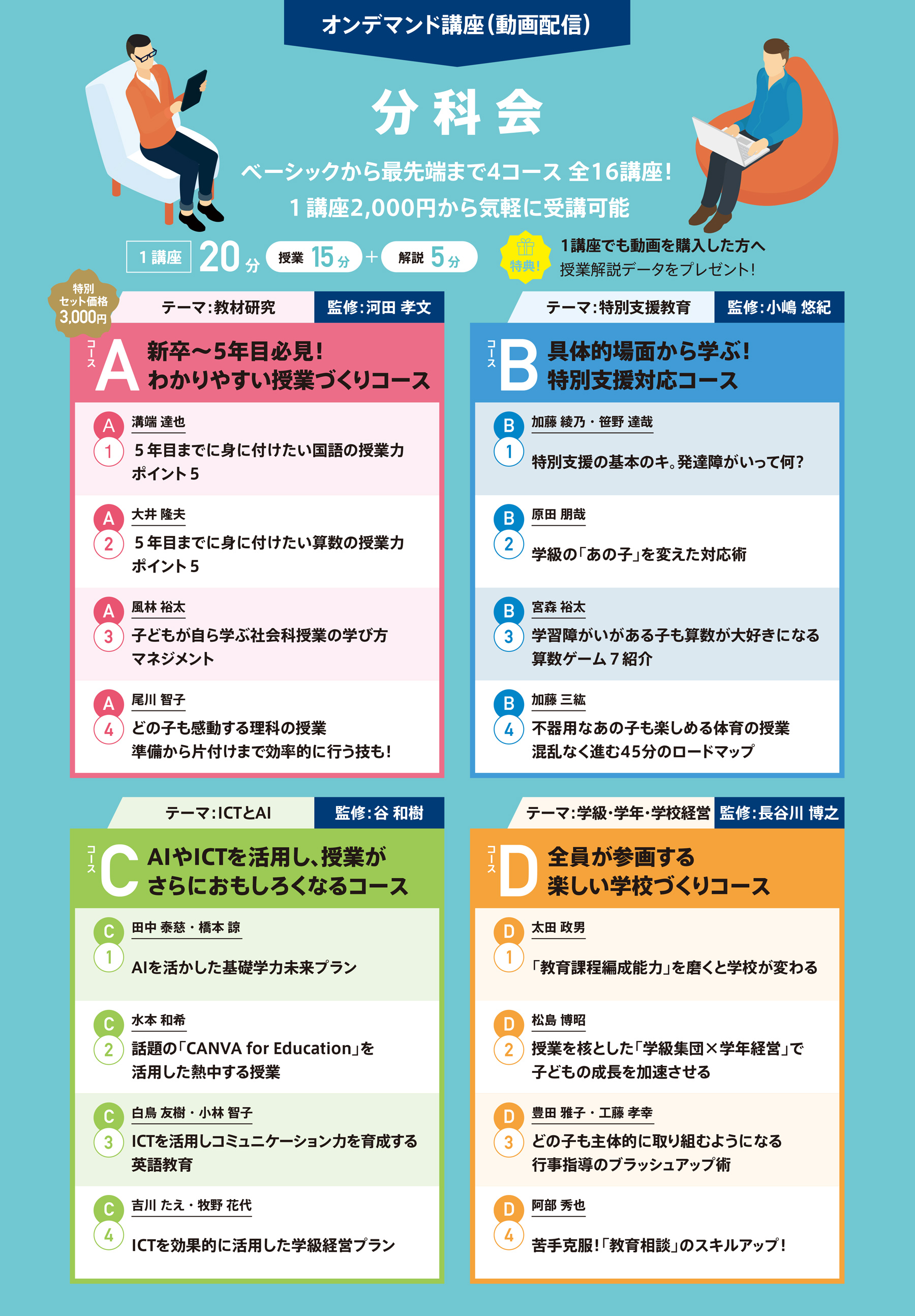 TOSSサマーセミナー分科会はオンデマンド配信です。 ベーシックから最先端まで4コース 全16講座! 1講座2,000円から気軽に受講可能です。 2024年4月27日 販売開始 2024年7月22日 配信開始(17:00より) ※本サイトは、分科会のみのお申込み用サイトです。全体会+分科会セットのお申込みは下記Peatixよりお申込みください。